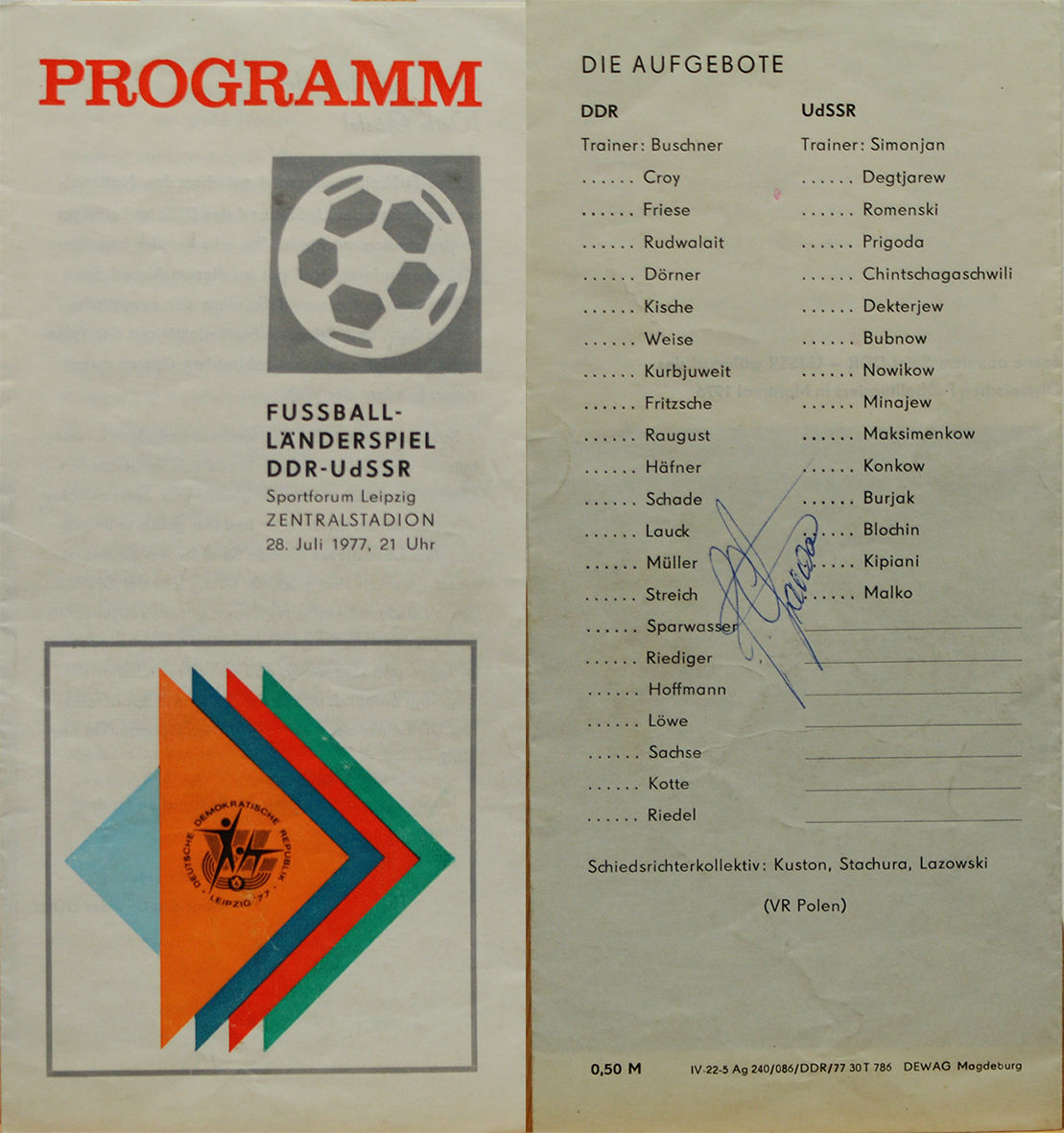 A peine les valises débarqués, nous voilà le 28 Juillet à Leipzig devant 95 000 Spectateurs, la RDA affronte l'URSS en match amical, victoire 2 - 1 (Häfner 8', Sparwasser 89' et Bubnov 22')